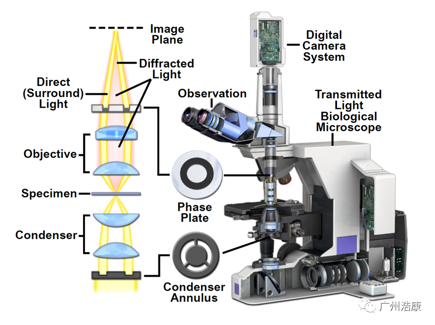 物鏡后方的相位板由共軛面和補償面組成,共軛面為環(huán)狀,是直射光通過部分,通常涂有吸收光線的物質(zhì),補償面位于共軛面的內(nèi)外兩側(cè)部分,是通過衍射光的部分。