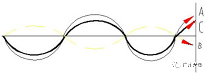 光線通過相差環(huán)板射入,通過聚光鏡射出后形成平行的波陣面。當(dāng)這些平面波碰到樣本的時候,一些光在穿過標(biāo)本時發(fā)生衍射,改變了它們和直射光之間的相位關(guān)系,新產(chǎn)生的球面波在從標(biāo)本射出后相位將被延遲λ/4。注意到現(xiàn)在有兩種類型的波,直射光和衍射光,它們之間存在λ/4的相差。在正相襯中,共軛面只鍍有吸收膜,補償面則鍍有相位膜,這樣直射光A僅被吸收,振幅減少,相位未被推遲;而衍射光B的相位則被延遲λ/4,使其與直射光的相位相差λ/2(λ/4+λ/4),在中間相平面上的合成波C的振幅等于兩波振幅的差(引起相消干涉),這時樣本要比背景暗(因為背景只有直射光,被吸收,振幅減少),這就是正相襯的效果。