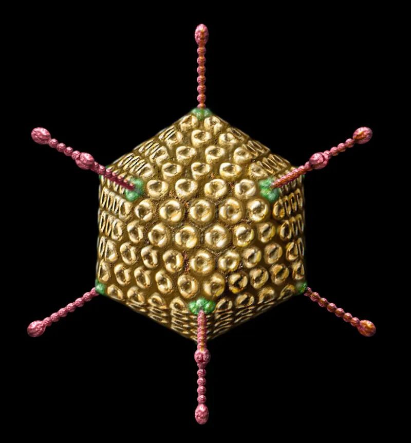 腺病毒(adenovirus)是一種沒有包膜的直徑為70~90 nm的顆粒,由252個殼粒呈廿面體排列構(gòu)成。每個殼粒的直徑為7~9 nm。衣殼里是線狀雙鏈DNA分子,約含35 000 bp,兩端各有長約100 bp的反向重復序列。由于每條DNA鏈的5'端同相對分子質(zhì)量為55X103Da的蛋白質(zhì)分子共價結(jié)合,可以出現(xiàn)雙鏈DNA的環(huán)狀結(jié)構(gòu)。