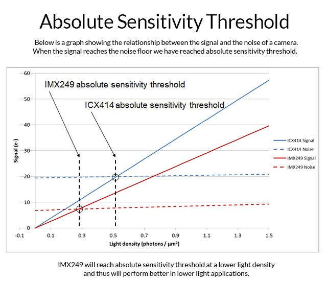 絕對(duì)靈敏度閾值是使信號(hào)等于噪音所需的光子數(shù)。光子數(shù)量越少,相機(jī)能從圖像噪聲中識(shí)別出有用成像數(shù)據(jù)的效果就越佳。此規(guī)格對(duì)于光線極低的應(yīng)用環(huán)境而言尤為重要。與僅看QE或噪聲不同,絕對(duì)靈敏度閾值還能使我們更加了解傳感器的低光性能,因?yàn)樵撻撝低瑫r(shí)考慮了傳感器的QE和顳暗噪聲與散粒噪聲。